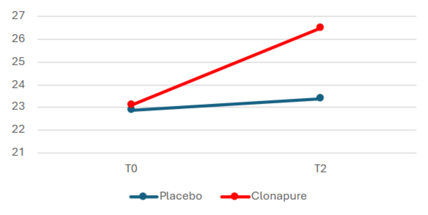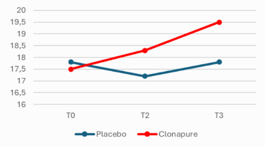 The use of CLONAPURE was associated with enhanced intermittent aerobic capacity in elite players, demonstrated by a solid 13.3% increase in VIET performance, reflecting improved tolerance to repeated high-intensity aerobic efforts, with the chart below reflecting said results in a more graphic way.