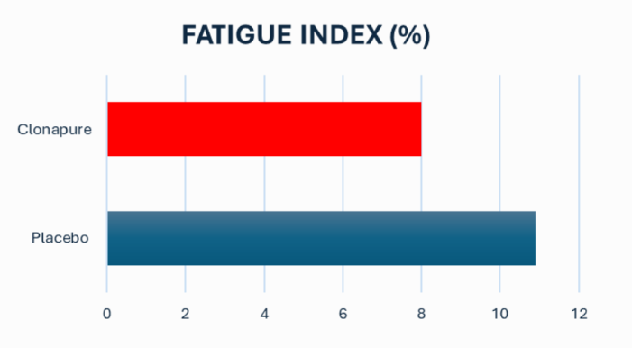 In this test, the key performance indicators are peak power (initial jump) and fatigue index (loss of height over time). Regarding mean power and peak power, the CLONAPURE group demonstrated early and sustained improvements. However, it’s the fatigue index results that are more striking.