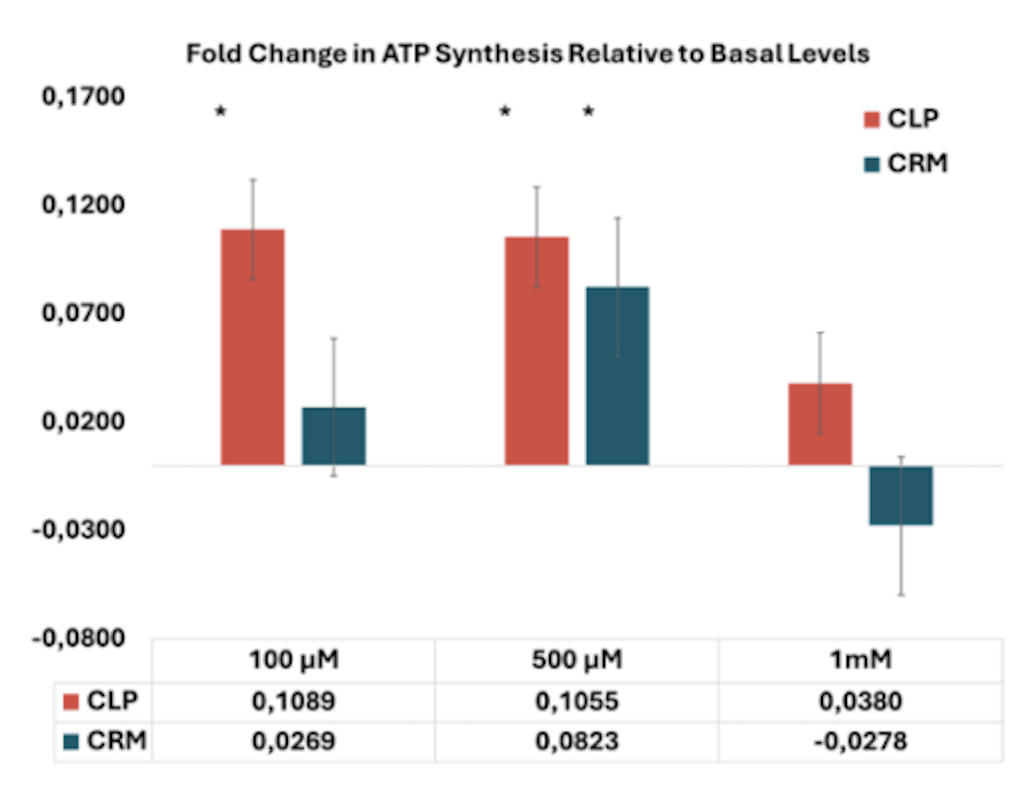 In neuronal cells, CLONAPURE® exhibited an effect roughly four times higher than CrM, indicating superior bioenergetic performance. Notably, its efficacy was observed even at concentrations up to five times lower, reinforcing its enhanced cellular potency and efficiency (Hernández-Bueno et al., 2025).